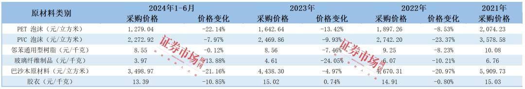 具体来看,2022年,其原材料PET 泡沫的采购价格下降了8.53%,PVC 泡沫的采购价格下降了23.37%,邻苯通用型树脂的采购价格下降了8.23%。玻璃纤维制品的采购价格下降了10.21%,巴沙木原材料的采购价格下降了20.97%,胶衣的价格下降了0.80%。2023年,除了胶衣采购价格微涨0.74%外,其他原材料采购价格均有不同程度的下降。2024年上半年,原材料采购价格同样全线下降。