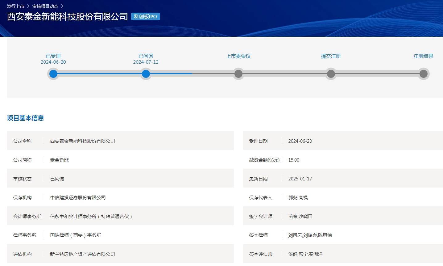 泰金新能于2024年6月递交招股书,计划募资15亿元。2024年7月,上交所对泰金新能发出问询函。今年1月中,泰金新能回复首轮审核问询。