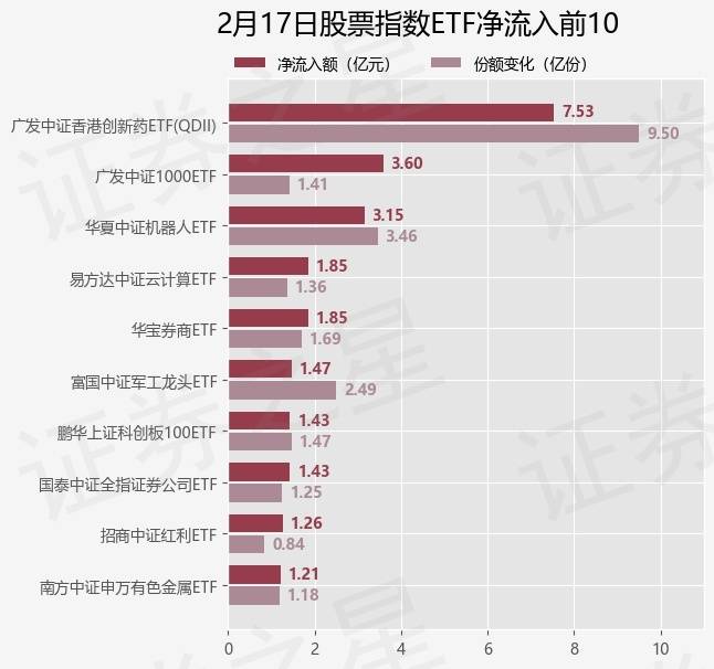 当日有173只股票指数ETF基金出现资金净流入,其中净流入排首位的是广发中证香港创新药ETF(QDII)(513120),份额增加了9.5亿份,净流入额为7.53亿元。
