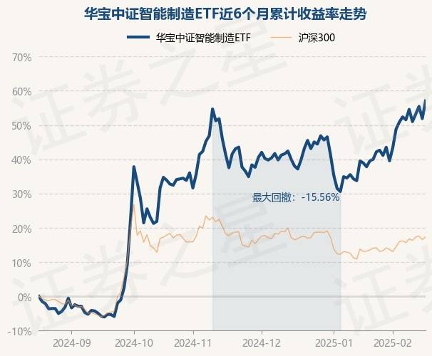 证券之星消息,2月19日,华宝中证智能制造ETF最新单位净值为1.2248元,累计净值为1.2248元,较前一交易日上涨3.39%。历史数据显示该基金近1个月上涨12.51%,近3个月上涨10.91%,近6个月上涨57.01%,近1年上涨53.68%。该基金近6个月的累计收益率走势如下图: