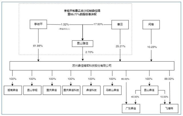 根据招股书,李结平直接持有公司61.86%的股份。此外,李结平担任昆山臻佳的执行事务合伙人,通过昆山臻佳控制公司2.70%的股份表决权。李结平直接和间接合计控制鼎佳精密64.56%的股份表决权,为公司的控股股东。