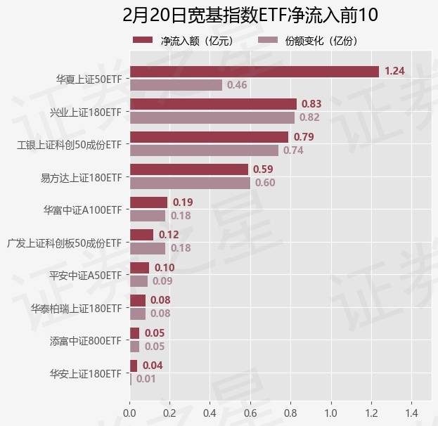 当日有12只宽基指数ETF基金出现资金净流入,其中净流入排首位的是华夏上证50ETF(510050),份额增加了4590.0万份,净流入额为1.24亿元。