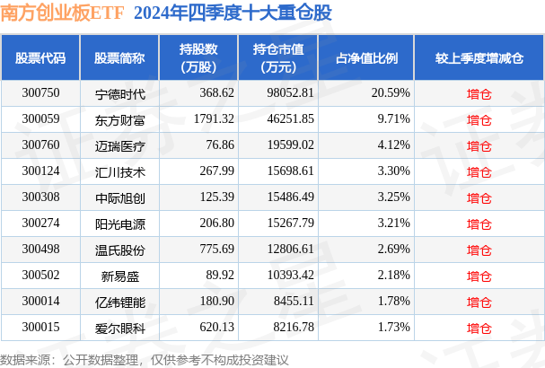 南方创业板ETF为指数型-股票基金,根据最新一期基金季报显示,该基金资产配置:股票占净值比99.98%,无债券类资产,现金占净值比0.03%。基金十大重仓股如下:
