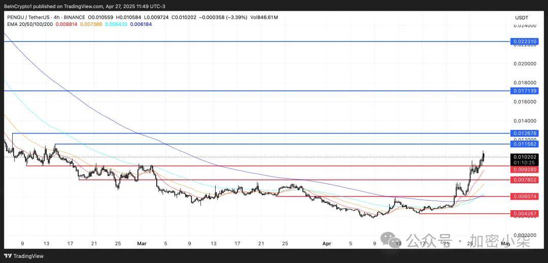 但市场风向正在转变。过去一周,PENGU 价格飙升 107%,近 24 小时内涨幅超 16%。若涨势延续,其将直面 0.011 美元关键阻力位。一旦突破,0.0126 美元关口或将成为新目标;若多头持续发力,0.0171 美元乃至 0.0223 美元也有望触及,这将助力 PENGU 时隔数月后再次突破 0.02 美元重要心理价位。