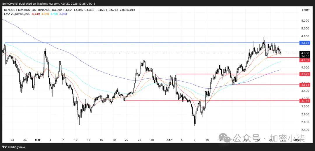 技术层面释放危险信号:RENDER 的指数移动平均线(EMA)或现 “死亡交叉”,暗示下行风险加剧。若趋势转跌,4.25 美元支撑位将首当其冲,一旦失守,价格或接连下探 3.82 美元、3.55 美元,甚至触及 3.14 美元。不过,若多头重新集结,RENDER 仍有机会向 4.63 美元发起反攻。