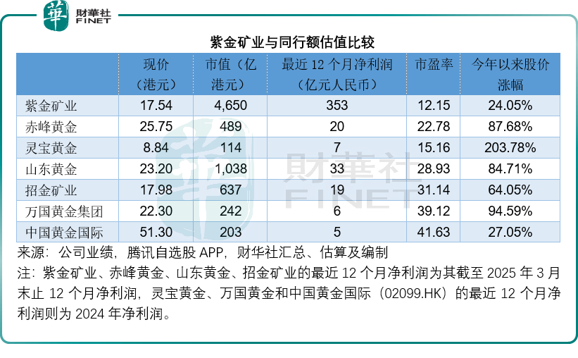 从估值来看,紫金矿业的市盈率估值也是同行中的最低,见下表,按H股现价17.54港元计,紫金矿业的市值为4,650亿港元,仅相当于其截至2025年3月31日止12个月扣非归母净利润353亿元人民币的12.15倍。