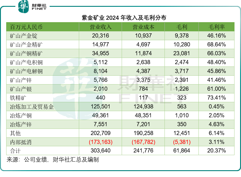 除了矿产业务外,紫金矿业还经营利润率偏低但走量的冶炼和贸易业务,这些利润较低的业务占了其收入的大比重,也因此,尽管紫金矿业的矿山产贵金属和基本金属业务毛利率高达40%、60%甚至70%,但是只有单位数毛利率的冶炼和贸易业务由于贡献更高,一下子将其整体毛利率拉低。