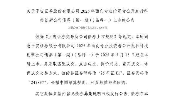 5月15日,上交所发布关于平安证券股份有限公司2025年面向专业投资者公开发行科技创新公司债券(第一期)(品种一)上市的公告。