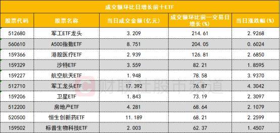从成交额环比增长前十的ETF来看,军工ETF龙头(512680)成交额环比增长214%位居首位;A500指数ETF(560610)成交额环比增长204%位居次席。