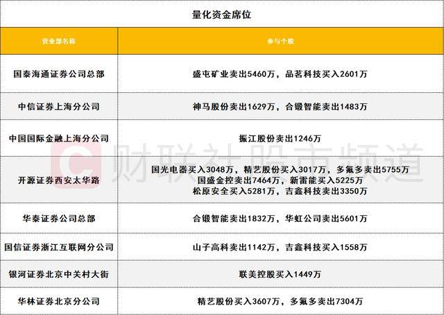 量化资金活跃度较低,芯片股华虹公司遭一家量化席位卖出5601万。多氟多遭两家量化席位卖出1.3亿。