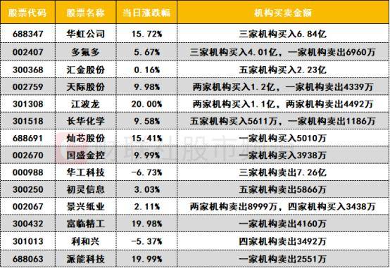 今日龙虎榜机构活跃度较高,买入方面,两只固态电池股获机构买入,其中多氟多获机构买入4.01亿,天际股份获机构买入1.2亿。存储芯片人气股江波龙获两家机构买入1.1亿,同时遭两家机构卖出4492万。芯片概念股华虹公司获机构买入6.84亿。