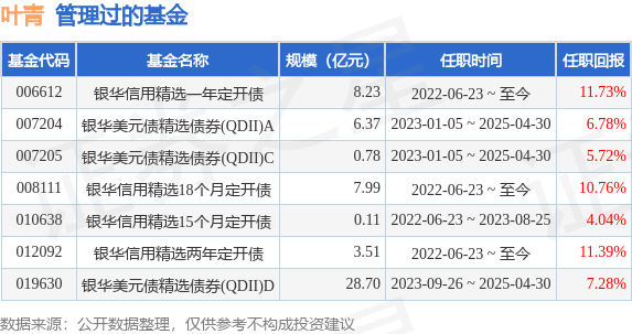 叶青女士:中国国籍,研究生、硕士,曾就职于九州证券股份有限公司。2016年10月加入银华基金,历任投资管理三部固收研究部信用研究员,现任投资管理三部基金经理助理。2022年6月23日起担任银华信用精选两年定期开放债券型证券投资基金基金经理、银华信用精选18个月定期开放债券型证券投资基金基金经理、银华信用精选一年定期开放债券型发起式证券投资基金基金经理、银华信用精选15个月定期开放债券型证券投资基金基金经理。2025年4月24日起担任银华岁丰定期开放债券型发起式证券投资基金基金经理助理。曾任银华美元债精选债券型证券投资基金(QDII)基金经理。