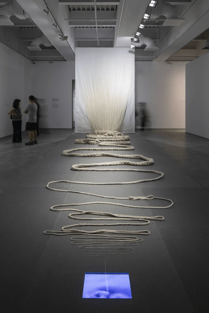 入口处,1997年的同名作品《没什么好玩的》格外醒目:数百根白色棉线从天花板垂落,每根线的末端都系着一枚缝衣针,针下悬挂着纽扣、布料等日常物件,微风拂过,棉线轻轻晃动,针与物件碰撞发出细微声响。往里走,《绑着的桌子》系列作品充满视觉冲击力:木质桌子被彩色丝线紧紧缠绕,丝线勒出的痕迹仿佛“桌子的伤痕”,既传递出束缚感,也暗含着挣脱的力量;近年的影像作品《日常·非常》则记录了她用丝线“改造”日常场景的过程——丝线缠绕着椅子、书架、餐具,让熟悉的物件变得陌生,引发观众对“日常”的重新思考。