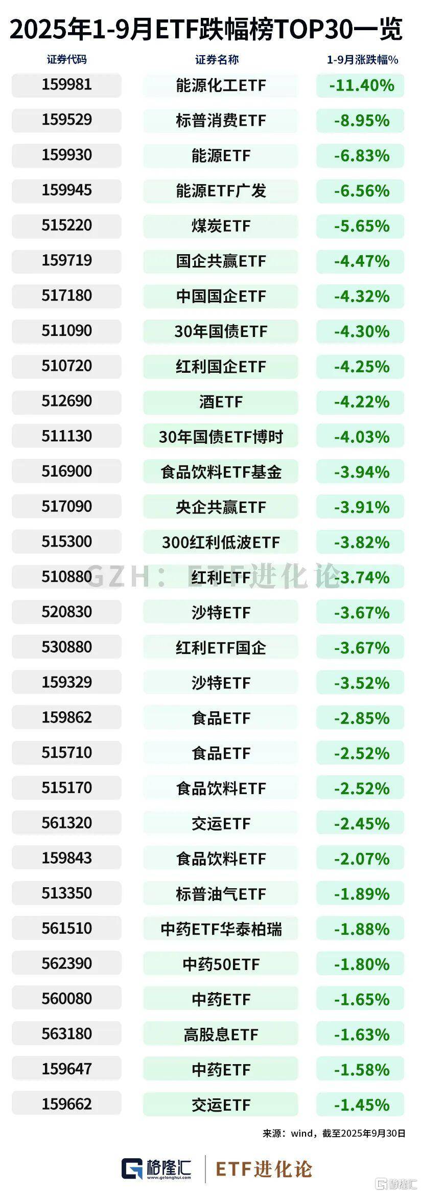 银行ETF、金融ETF、红利ETF三季度跌幅居前;能源ETF、煤炭ETF、酒ETF年内跌幅居前。