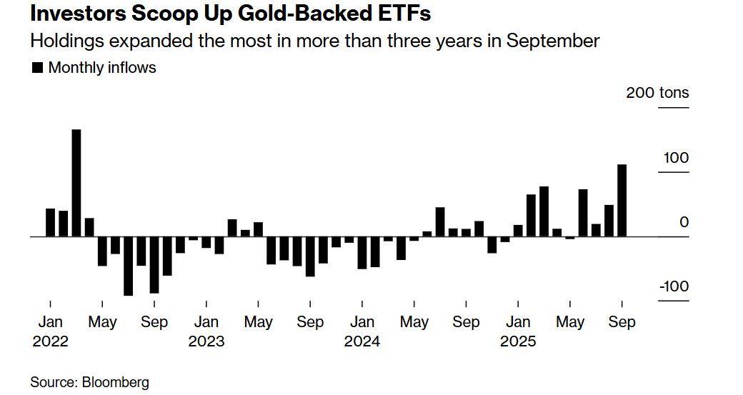 今年以来,黄金价格飙升近48%,有望创下1979年以来的最大年度涨幅。随着各国央行纷纷买入黄金,以及美联储重启降息后黄金ETF持仓量不断增加,黄金价格持续走高。彭博社编制的数据显示,9月黄金ETF月度资金流入量创下三年来新高