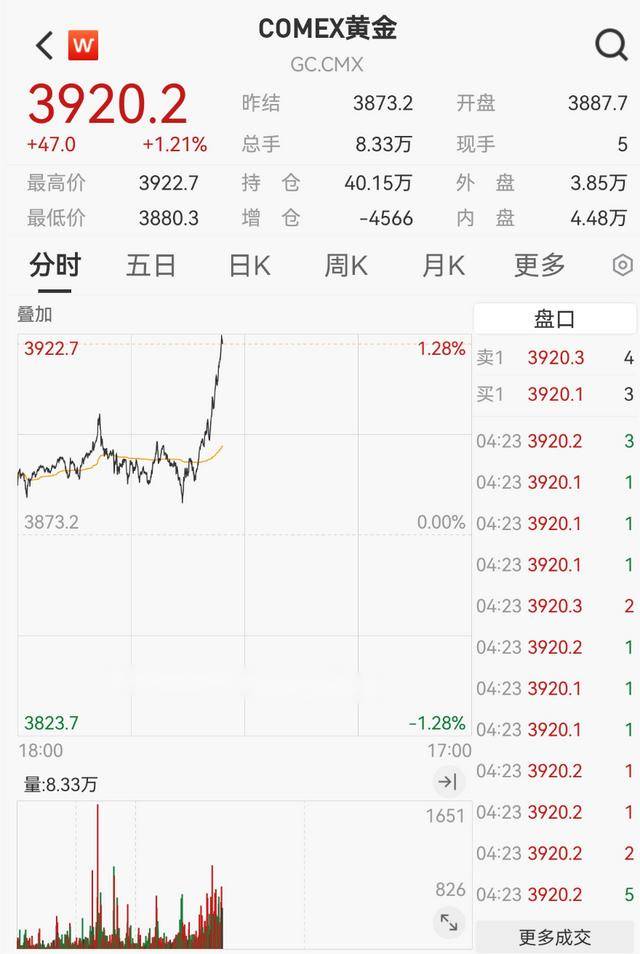 COMEX黄金同步拉升,日内涨超1%,截至发稿报3920.2美元/盎司。