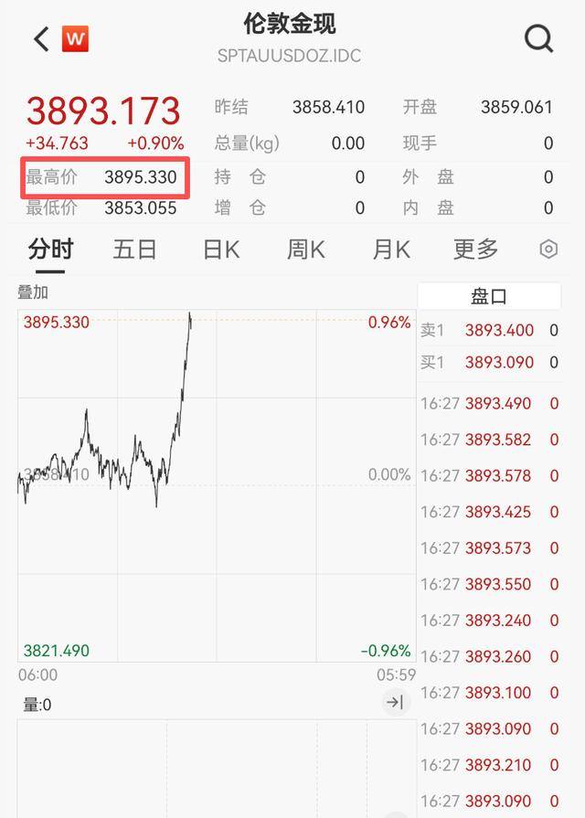 10月1日,现货黄金短线拉升,站稳3890美元/盎司大关。截至记者发稿,伦敦金现最高价突破3895美元/盎司,再创历史新高。