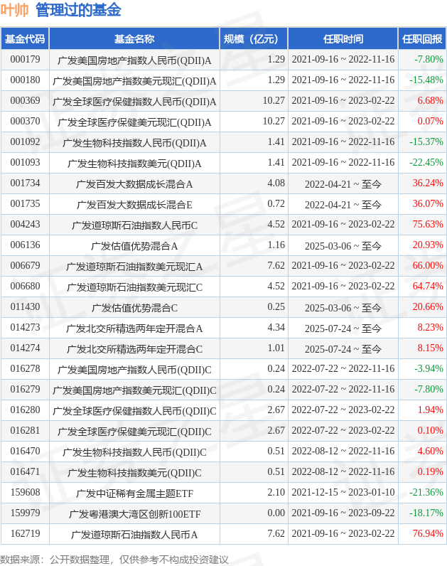 叶帅先生:中国国籍,博士研究生,博士。2016年12月加入广发基金管理有限公司,曾先后任指数投资部研究员、投资经理。2021年9月16日担任广发粤港澳大湾区创新100交易型开放式指数证券投资基金基金经理。2021年9月16日至2022年11月16日担任广发纳斯达克生物科技指数型发起式证券投资基金基金经理。曾任广发全球医疗保健指数证券投资基金基金经理。2022年4月21日起担任广发百发大数据策略成长灵活配置混合型证券投资基金基金经理。曾任广发美国房地产指数证券投资基金、广发中证稀有金属主题交易型开放式指数证券投资基金基金经理。曾任广发道琼斯美国石油开发与生产指数证券投资基金(QDII-LOF)基金经理。2025年3月6日担任广发估值优势混合型证券投资基金基金经理。2025年7月24日起任广发北交所精选两年定期开放混合型证券投资基金的基金经理。