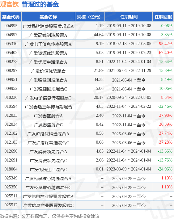 观富钦先生:管理学硕士,持有中国证券投资基金业从业证书。2011年6月至2012年6月在广州证券股份有限公司研究所任家电行业分析师,2012年6月至2015年4月在中投证券有限责任公司研究总部任计算机行业分析师。2015年4月加入广发基金管理有限公司,历任研究发展部研究员、基金经理助理。2018年2月13日至2022年8月5日任广发电子信息传媒产业精选股票型发起式证券投资基金基金经理。2020年6月2日至2024年4月10日担任广发稳健增长开放式证券投资基金基金经理助理。2020年10月21日起担任广发稳健回报混合型证券投资基金基金经理助理。2021年6月4日起担任广发稳健回报混合型证券投资基金基金经理。2021年6月4日至2022年11月29日担任广发价值优势混合型证券投资基金基金经理。2022年11月4日至2024年2月22日任广发睿选三年持有期混合型证券投资基金的基金经理。2022年11月4日至2024年1月4日担任广发消费领先混合型证券投资基金基金经理。曾担任广发优质生活混合型证券投资基金基金经理。2025年3月6日担任广发沪港深精选混合型证券投资基金基金经理。