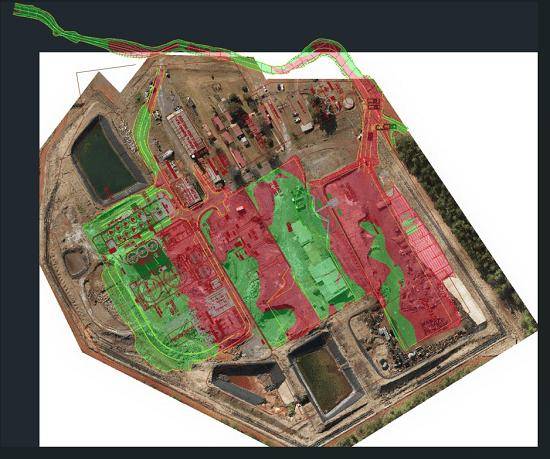 大规模土方工程挖方与填方需求示意图(红色区域为挖方区,绿色区域为填方区)