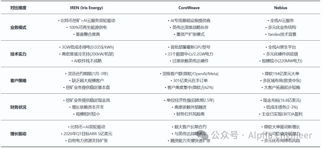这里重点分析IREN、CoreWeave、Nebius这三家公司的优劣势。