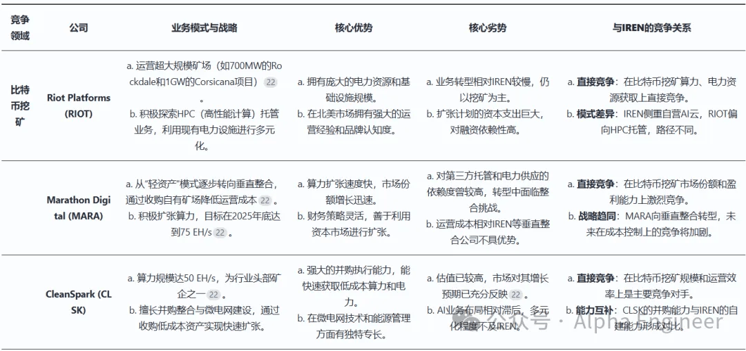 IREN正处于从纯比特币挖矿企业向综合性AI基础设施提供商转型的关键阶段,因此其竞争格局呈现双重性。
