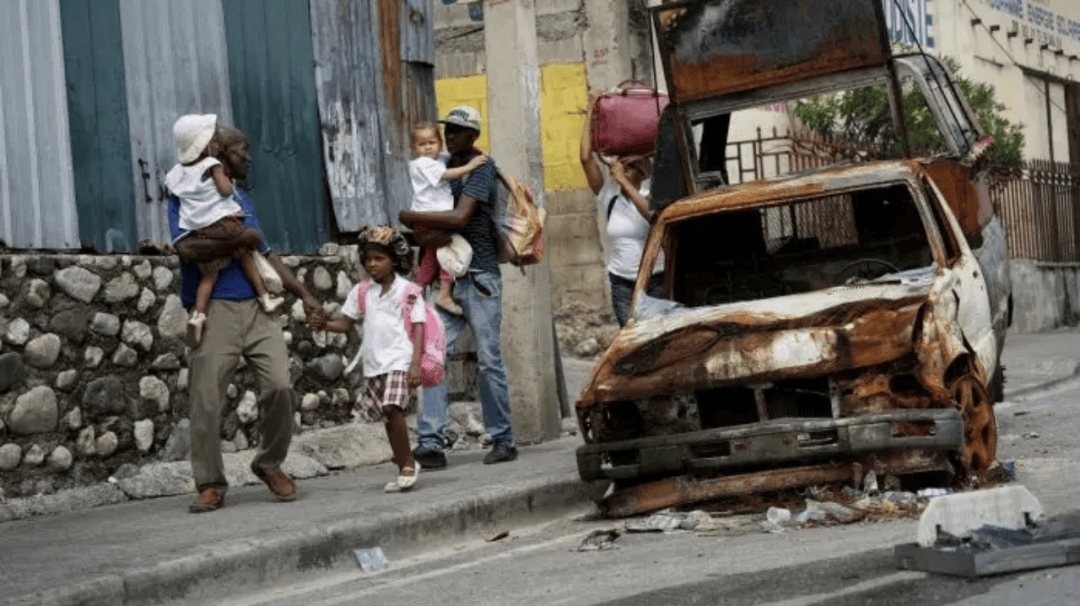 202452日,海地太子港,正进行的犯罪暴力之中居民在一次袭击后撤离德尔马斯22社区之际走过一辆被烧毁的车
