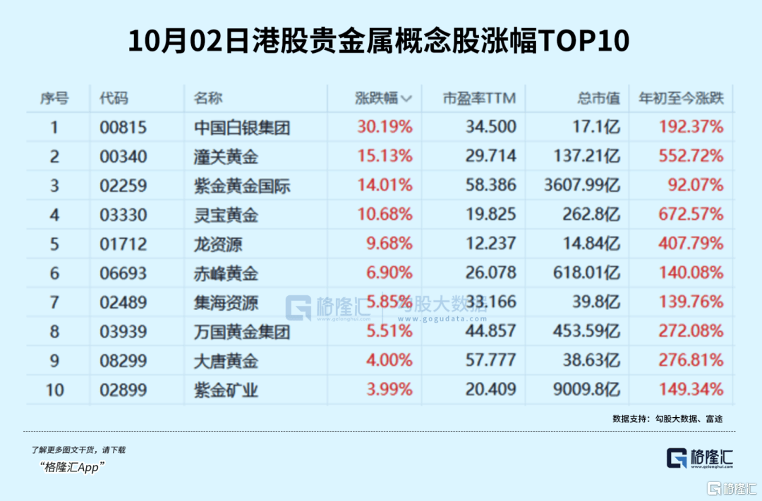 10月2日,港股国庆假期开市首日,贵金属概念全线大涨,板块中多只黄金股涨幅超10%,其中中国白银集团更是大涨30%,创出近4年新高。