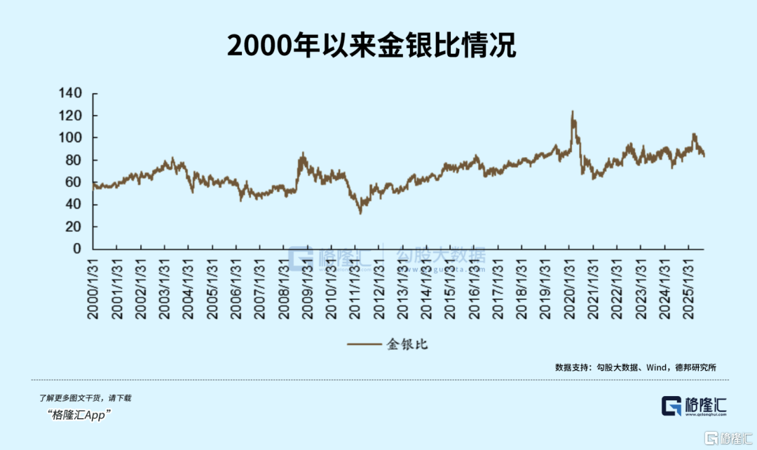 极端行情中,该比值曾两度突破100,2020年新冠疫情引发流动性危机,比值飙升至123的历史峰值;2025年4月,受全球贸易摩擦与制造业收缩影响,比值再度触及105.26的历史次高,为后续白银的估值修复埋下伏笔。