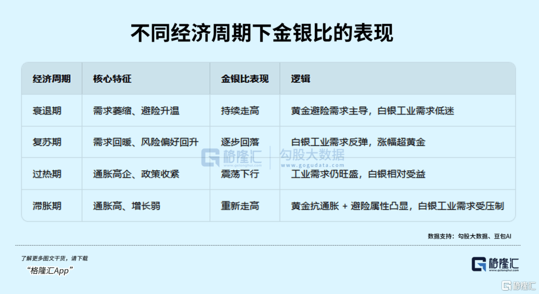 当经济进入复苏阶段,光伏、电子、新能源等行业的需求扩张,会直接拉动白银的工业消费需求,此时白银的价格涨幅往往超过黄金,进而导致金银比回落。