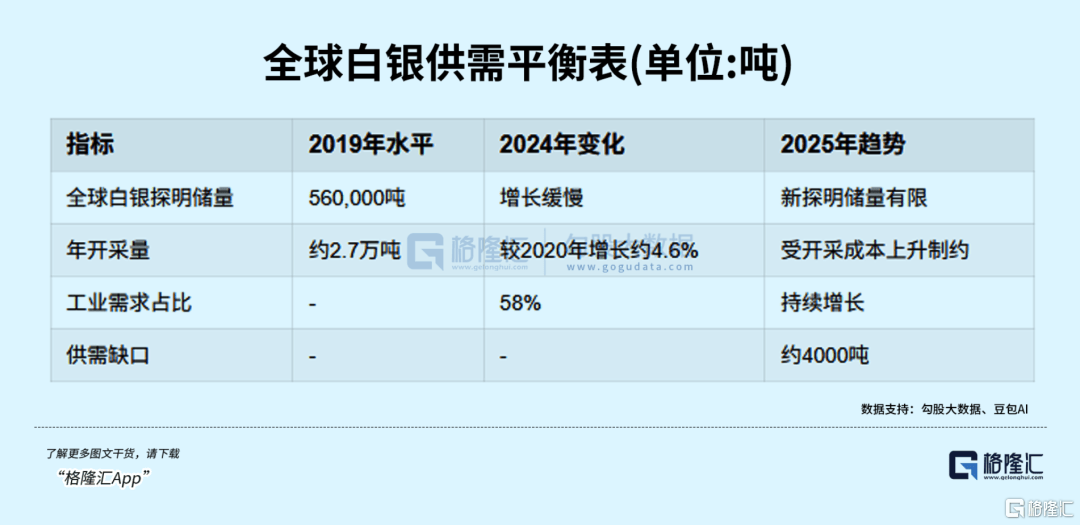 据报道,目前全球白银已连续5年出现供给需求缺口,根据2025年测算,全球白银产量比消费量少约4000吨。