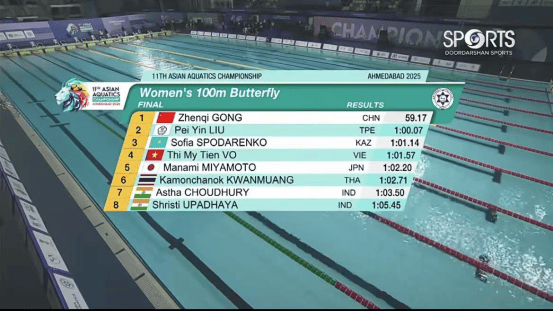 ▲女子100米蝶,龚真琦59秒17成绩夺冠。图源网络