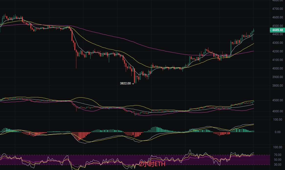 发稿前以太坊现价4450,丽盈观察目前盘口以太坊技术面和外部环境分歧导致趋势不明。K线形态出现了典型的看跌反转信号(三只乌鸦),且成交量极度缩量并伴随量价背离,削弱了上涨趋势的可靠性。此外,价格当前位于4421支撑位和4643阻力位之间,支撑位的有效性成为短期市场方向的关键,日线两日阳线从4145上涨至4458形成强势反弹,2小时高点4470附近出现明显上影线,表明短期存在一定抛压,MACD2小时多头趋势明显,EMA呈现多头排列,支撑力度较强,丽盈连续多日坚持的多头依旧有效,跟随趋势多为主,谨慎开空