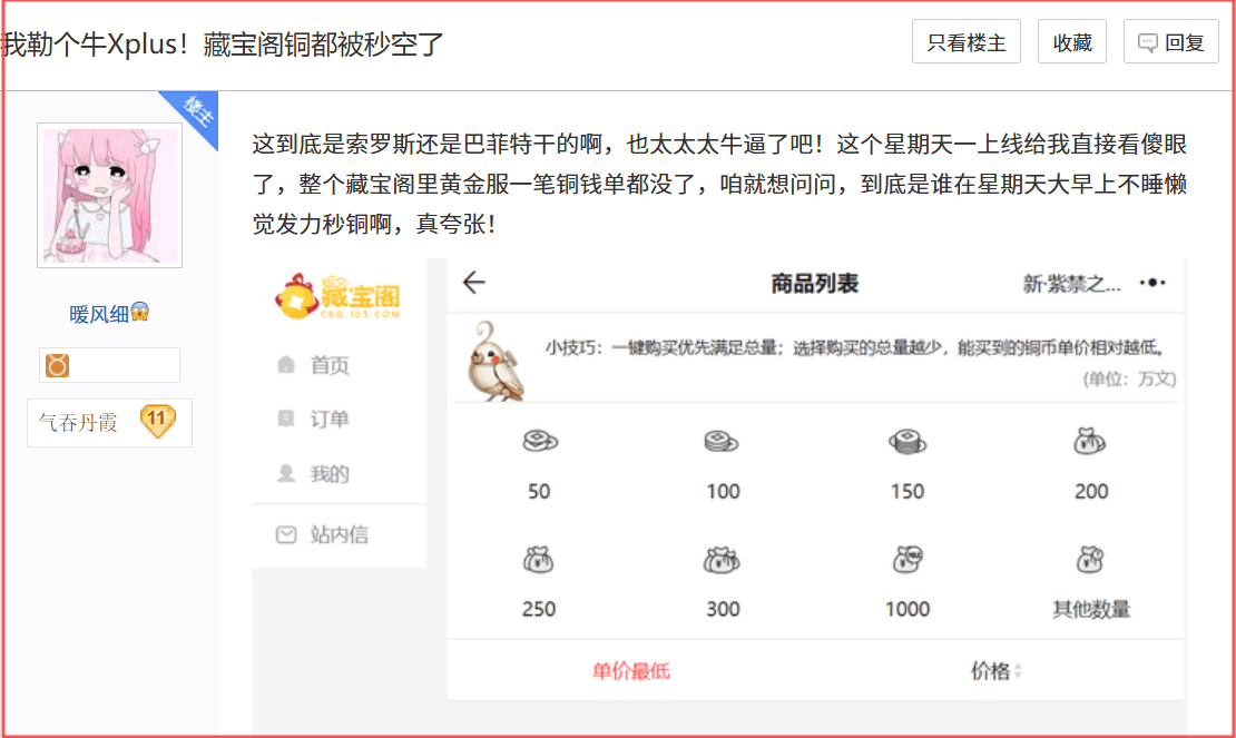 于是在短短一两天后,大家就开始疯狂的抢铜钱,甚至出现一夜之间扫空藏宝阁,让铜钱价格直接涨停板的局面。