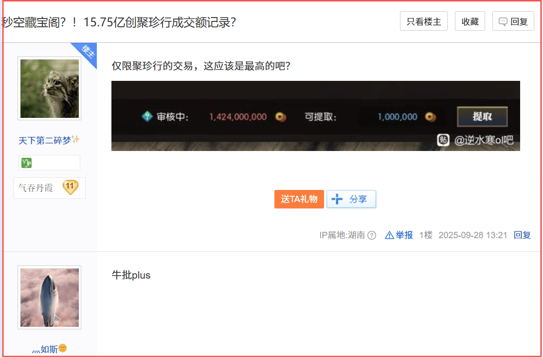 15.75亿创国游成交额记录!... 游戏玩多了,什么离谱的事情都能遇得到。这几天,《逆水寒》黄金服的玩家们,就遇到了史无前例的冲击——土...