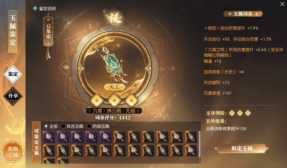 而75级玉佩,更是在之前玉佩玩法的基础上进行了升级。不仅品质种类增加,鉴定功能也将加入全新玉华机制,玩家们在鉴定玉佩的同时概率点亮一颗玉华点,让玉佩的所有词条效果获得百分比的增幅,对于已鉴定的玉佩,也可以消耗通过分解玉佩获得的凤仪玉髓进行升华操作,最多可额外再点亮两阶玉华,获得更高的成长空间。