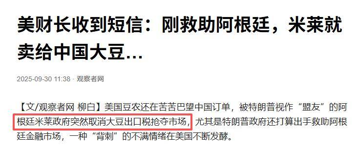 更让农民愤怒的是,9月30日,美国财长珍妮特·贝森特在纽约联合国大会期间被拍到的一条私人短信曝光。短信中,她抱怨阿根廷取消了谷物出口税,导致阿根廷以更低的价格将大豆卖给中国。消息迅速传播,成为热门话题。对美国豆农来说,这无疑是伤口上撒盐——政府对外国如此大方,却无法保住他们的大豆市场。