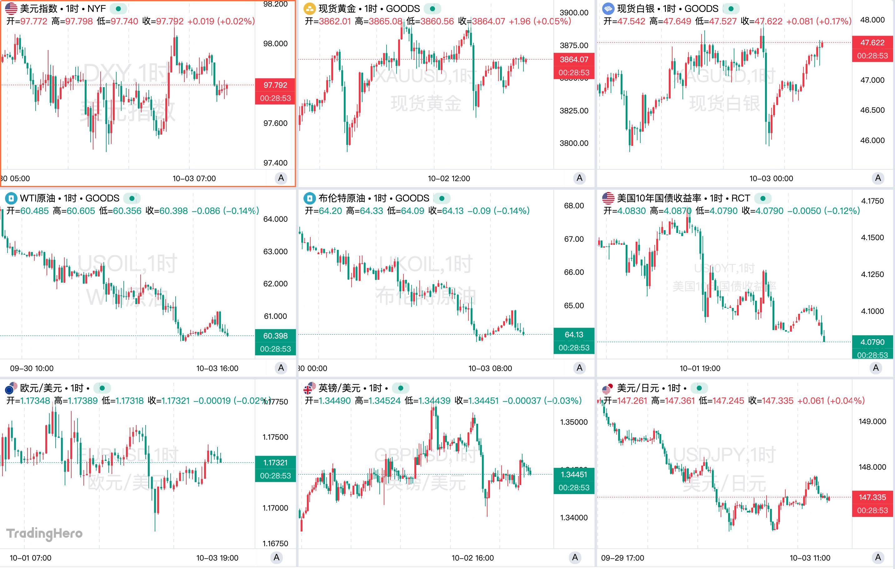 美元指数本周连续下跌后出现小幅反弹,整体料将录得三周来首度收跌。周初,因美国政府关门风险及就业数据不及预期,美指连跌三天,周四出现技术性反弹,盘中一度重回98关口。投资者对美国政府停摆时长与政策路径的不确定性压制了美元,但短期超跌后的反弹限制了跌势。截至发稿,美指报97.78。