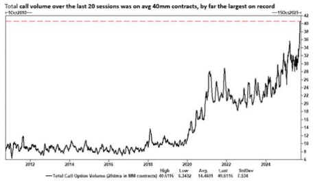 期权市场同样洋溢着乐观情绪。高盛交易部门自2010年以来的数据显示,在过去20个交易日中,平均每天成交4000万份看涨期权合约,为迄今纪录最高。