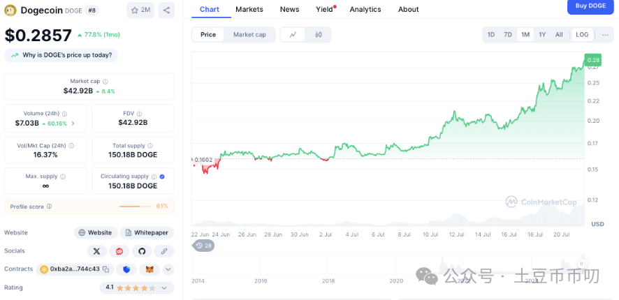 DOGE它现在市值 429.2 亿美元,24 小时交易量 70.3 亿美元,比之前涨了 105.6%,交易挺活跃的。