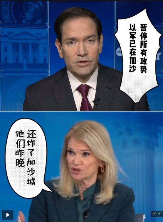 鲁比奥称,“幸运的是,以色列已经宣布暂停该地区的所有进攻性军事行动,除非是为了应对迫在眉睫的威胁……”但他此番说辞遭到节目主持人当场“打脸”。主持人“提醒”他,“加沙城昨晚还发生了轰炸”。