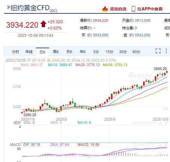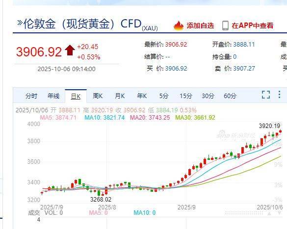 金价涨涨涨!现货黄金首破390... 红星资本局10月6日消息,今日早盘,现货黄金价格突破3900美元/盎司大关,再度创下历史新高。此时距...