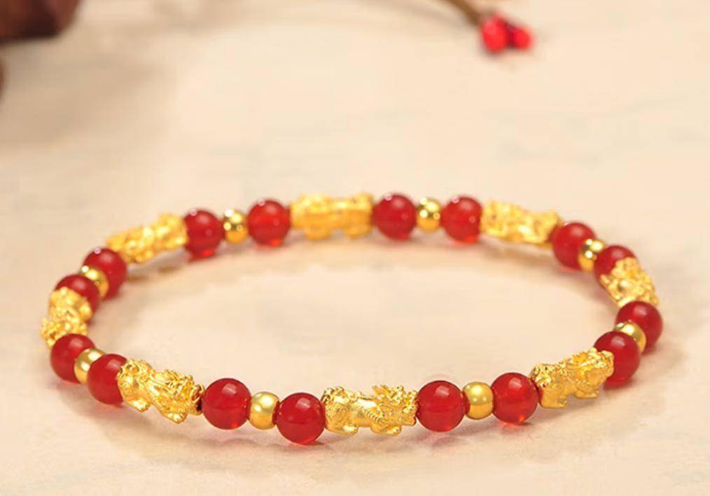 黄金转运珠,方寸之间承载千年祥瑞文化。它不仅是一件精致首饰,更是寄托美好愿景的贴身信物。从招财貔貅的霸气护主,到锦鲤跃龙门的灵动福运;从山海经神兽的神秘加持,到许愿瓶的浪漫期许——每颗珠子都在方寸金辉中凝练匠心与祝福。现代工艺赋予3D硬金立体浮雕的生动,5G黄金的璀璨光泽,让传统祥符焕发时尚生命力。无论是本命年辟邪、生日赠礼,或是日常点缀,这抹流转于腕间的鎏金光华,终将成为专属你的幸运图腾。