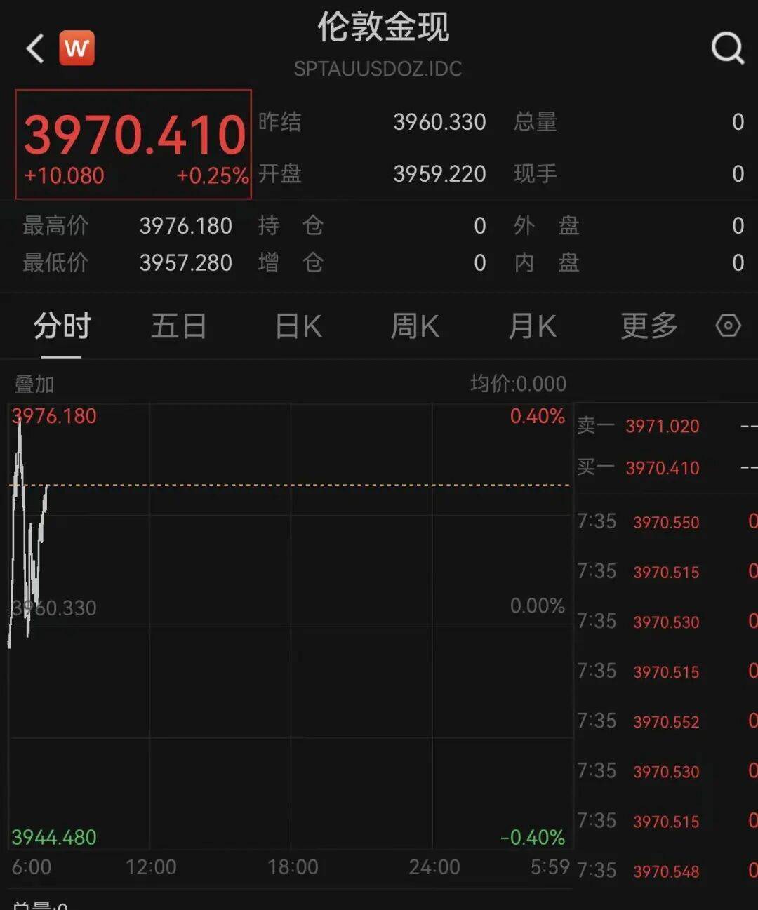 今早,黄金再度高开,截至发稿,现货黄金涨逾0.2%,盘中再创历史新高,一度涨至3976美元/盎司。