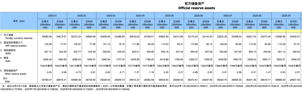 国家外汇管理局表示,2025年9月,受主要经济体宏观经济数据、货币政策及预期等因素影响,美元指数小幅震荡,全球金融资产价格总体上涨。汇率折算和资产价格变化等因素综合作用,当月外汇储备规模上升。我国经济保持总体平稳、稳中有进,高质量发展取得新成效,有利于外汇储备规模保持基本稳定。
