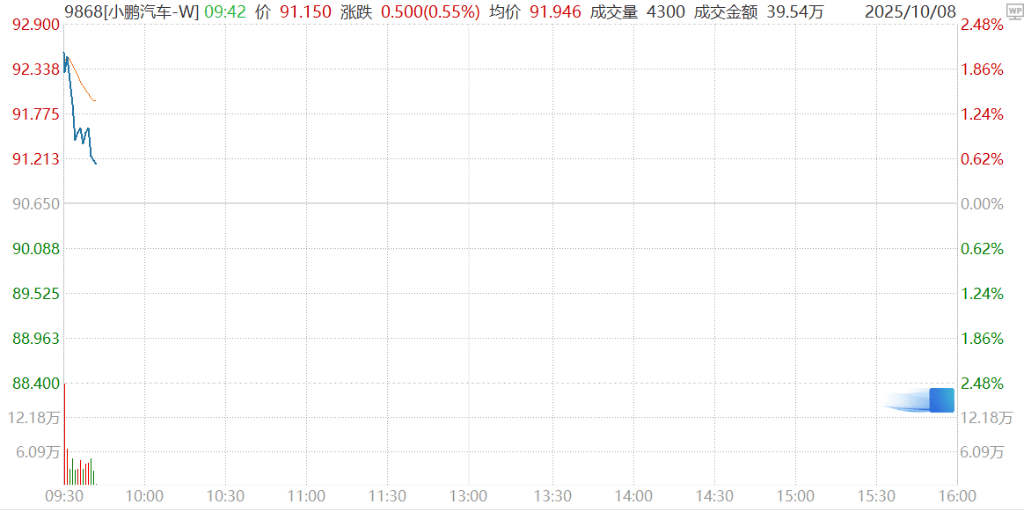 小鹏汽车高开2%,随后涨幅回落至0.44%。