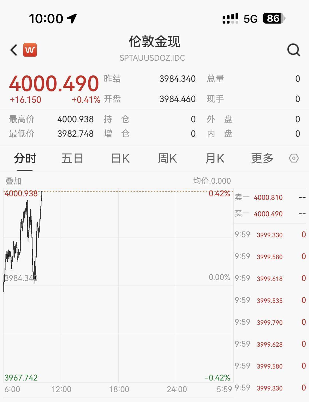 现货黄金突破4000美元/盎司大关,续创新高,年内涨幅超52%。