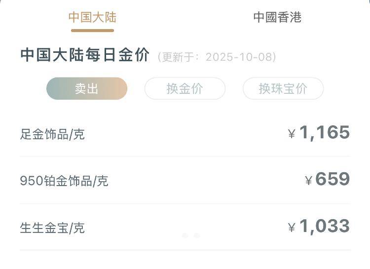 随着国际金价走高,10月8日,国内多个金饰品牌克价再创新高,多家站上1160元/克。老庙黄金金饰价格达到1176元/克,周生生足金饰品标价达到1165元/克;周大福为1162元/克;老凤祥价格达到1160元/克。