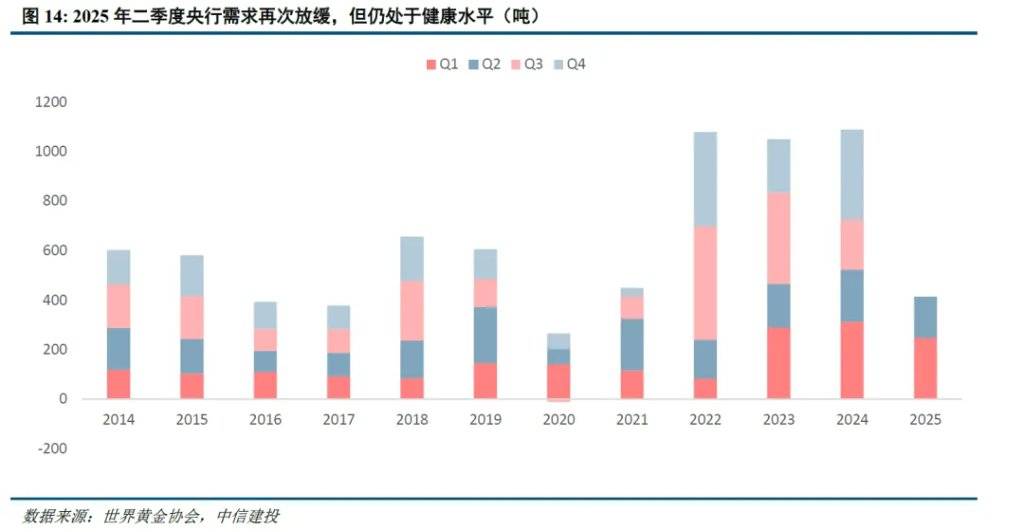 2025年各经济体央行仍是黄金需求的重要支柱,但购金步伐有所放缓。二季度,各经济体央行的购金需求保持在健康水平,达到166吨,但较上季度环比下降33%标志着央行购金步伐连续第二个季度放缓。