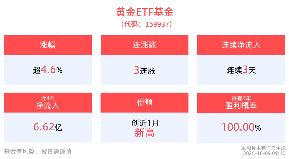 截至2025年10月9日 09:40,黄金ETF基金(159937)上涨4.66%, 实现3连涨。最新价报8.74元。拉长时间看,截至2025年9月30日,黄金ETF基金近2周累计上涨2.17%。